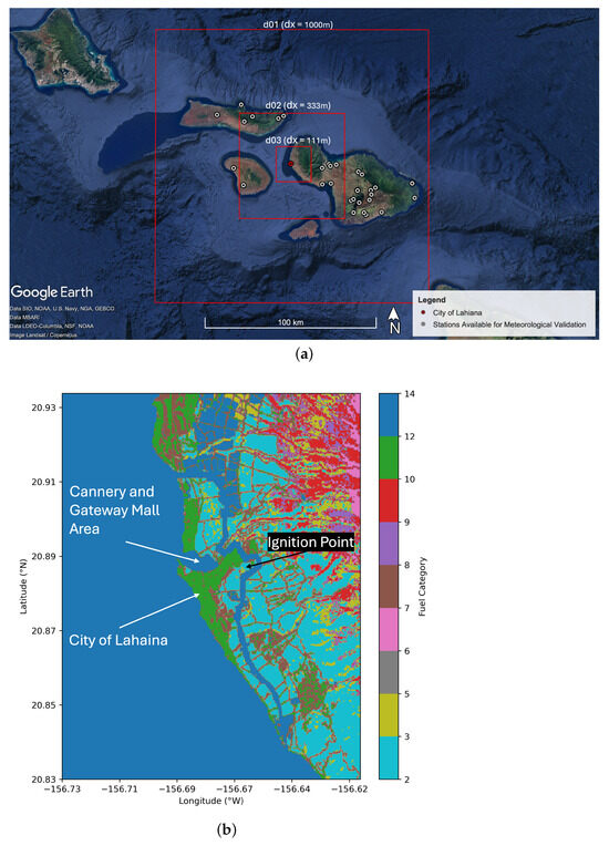 (a) Map depicting domains used in WRF-SFIRE simulation, including markers for the city of Lahaina and all weather stations available for meteorological validation. (b) Fuel map of 13 Albini fuel types used for innermost domain, including labels for Lahaina, point of ignition, and shopping malls where fuels were removed. Fuel categories 1 to 3 represent grasses, categories 4 to 7 represent shrubs, categories 8 to 10 represent timber litter, and categories 11 to 13 represent slash. Fuel category 14 represents nonburnable fuels in the model.
