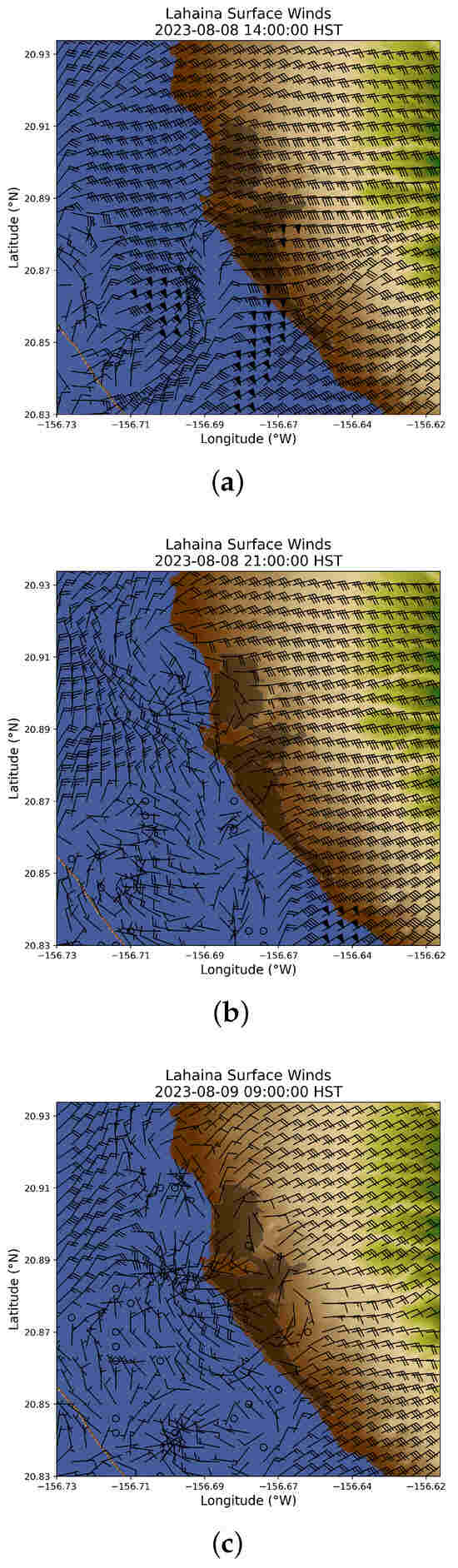 The lack of in situ observational weather data within Lahaina (and the leeward side of the West Maui Mountains in general) made the traditional validation of the basic weather variables during this event challenging. However, to obtain insight into the realism of the presented simulation, we used wind reports, weather observations from other locations, and satellite imagery.