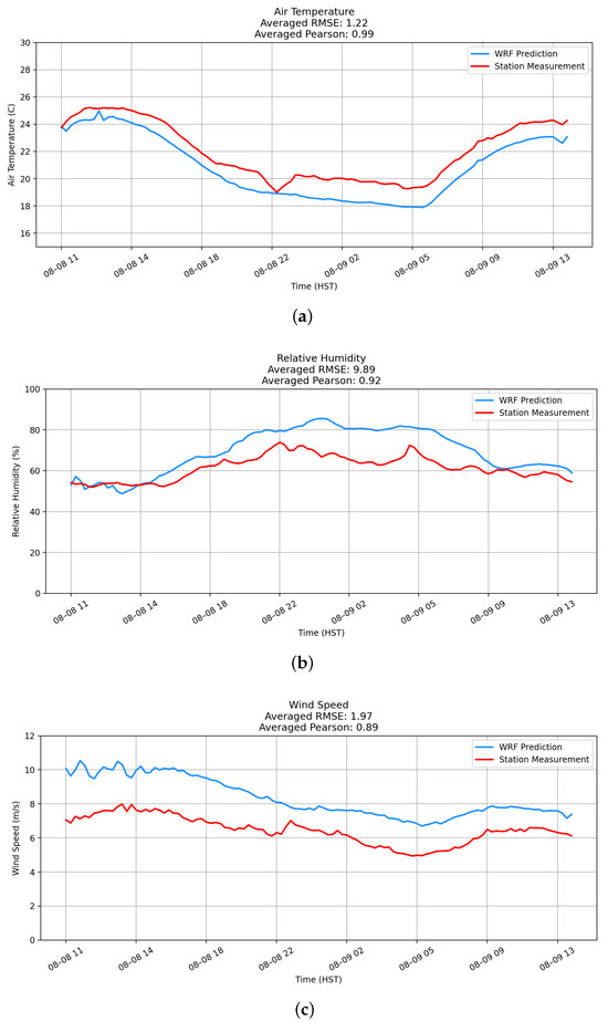 To evaluate the performance of our model in areas outside of Lahaina, we used data from various weather stations within our outermost domain and compared these results with our model data. Validity was determined in terms of the Pearson Correlation (r), and Root Mean Square Error (RMSE). The variables used for validation were 2 m air temperature, relative humidity, and wind speed resampled linearly to 15-min intervals to match model output frequency for the outermost domain. Further, 10 m wind speeds from the model were height-adjusted to the 6.1 m anemometer height with the equation used by Fovell (2017) [40], where a logarithmic wind profile is assumed and the surface roughness length used is derived from the Noah land surface model with multiparameterization (Noah-MP) [32].
