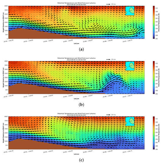 Cross-section through Lahaina plotting potential temperature (K) and wind vectors at times corresponding to (a) shortly before the time of the ignition, (b) the onset of the overnight inland movement of the hydraulic jump, and (c) the end of the wind event in Lahaina. Times match those in Figure 2.
