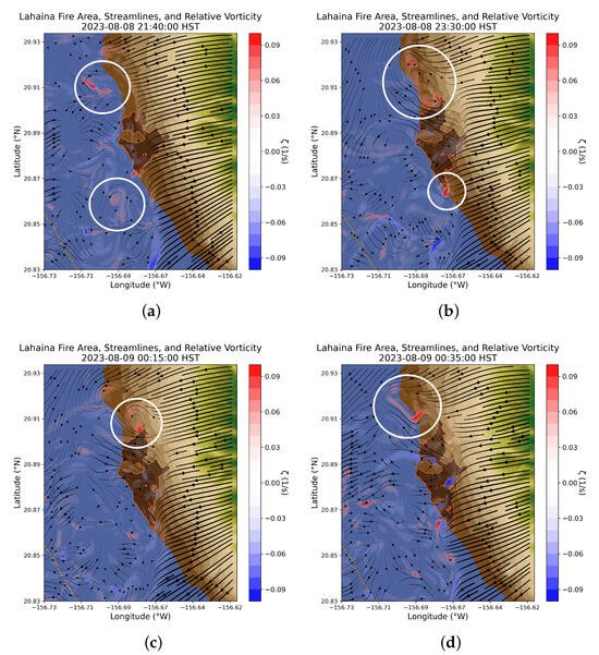 Relative vorticity (), surface streamlines, and fire areas as hydraulic jump moved inland overnight. Panels show different times: (a) 2023-08-08 21:40:00 HST, (b) 2023-08-08 23:30:00 HST, (c) 2023-08-09 00:15:00 HST, and (d) 2023-08-09 00:35:00 HST. Vortices are circled for improved readability.