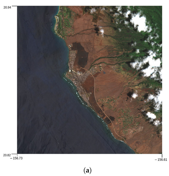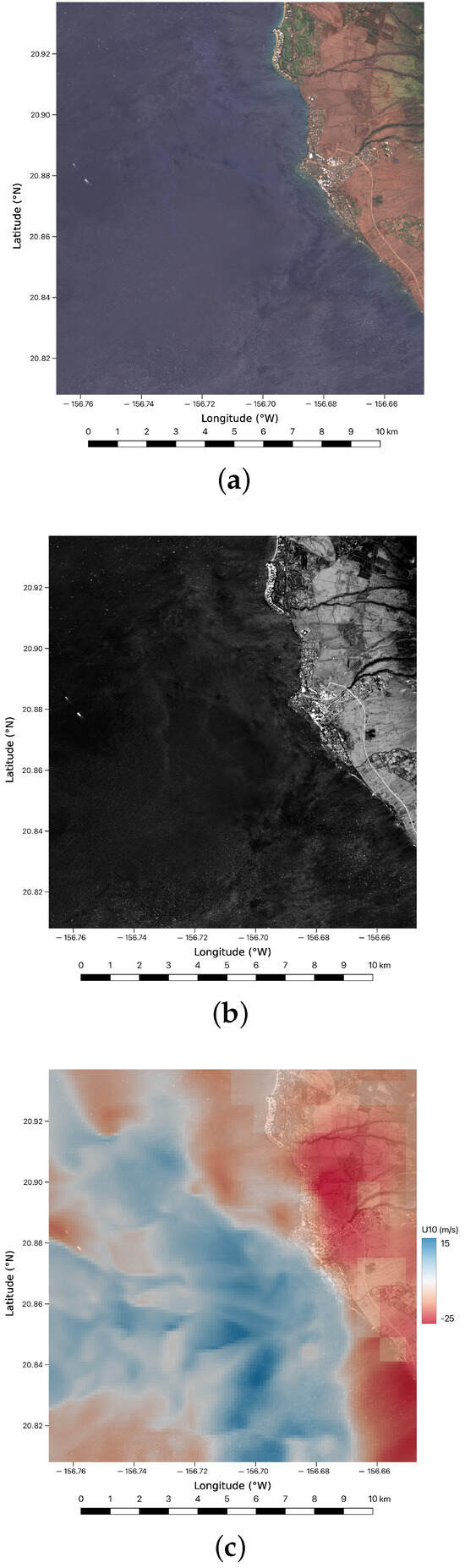 Due to the lack of weather observations near Lahaina either from buoys or stations, as well as the lack of an indication of rotor clouds in the satellite observations, the validation of the hydraulic jump is not straightforward. Therefore, in this study, we decided to evaluate the surface wind field and the location of the hydraulic jump by analyzing the formation of whitecaps offshore of Lahaina. As whitecaps form under a strong sustained wind, the presence or absence of whitecaps can help to qualitatively determine regions of stronger and weaker winds. We leveraged high-resolution (10 m) satellite visible imagery from Sentinel-2, which is available at 12:00 HST, 2.5 h before the fire (Figure 6a). The image from Sentinel-2, color-adjusted to help identify the whitecaps on the ocean, can be seen in Figure 6b. For reference, in panel (c), we show the same image overlaid with the simulated 10 m zonal winds at the same time.