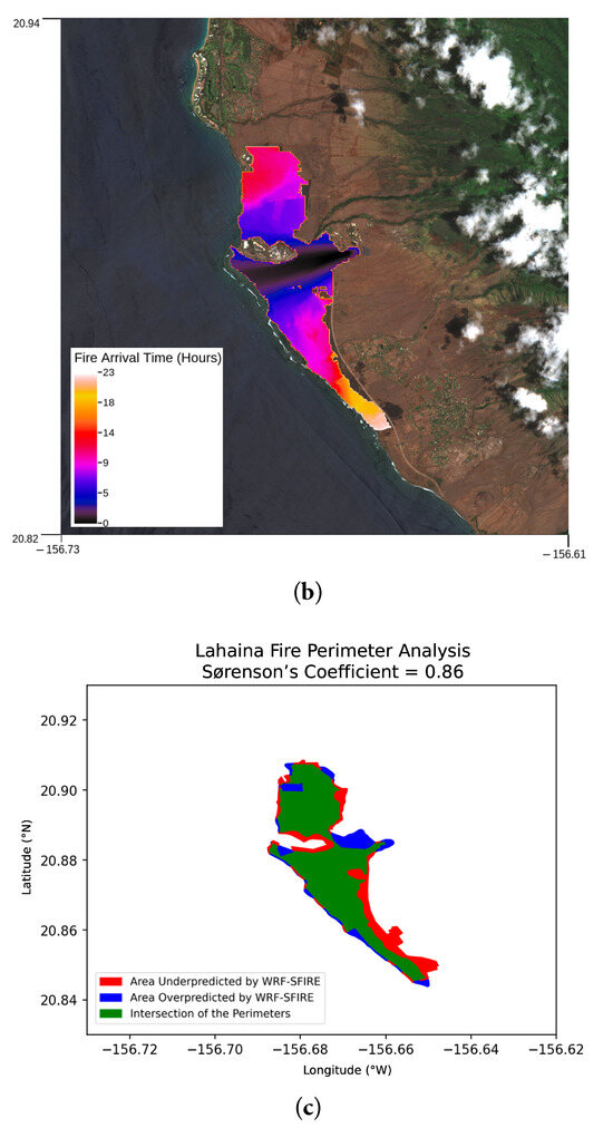 (a) True color image of Lahaina burn scar, taken on 14 August 2023 by the Copernicus Sentinel-2 satellite. (b) Fire arrival time (hours) from coupled simulation overlaid on Sentinel-2 imagery. Fire arrival time represents how long the simulated fire took to reach any given point on the grid. (c) Verification of the final simulated fire extent from coupled simulation and Sørensen’s coefficient.