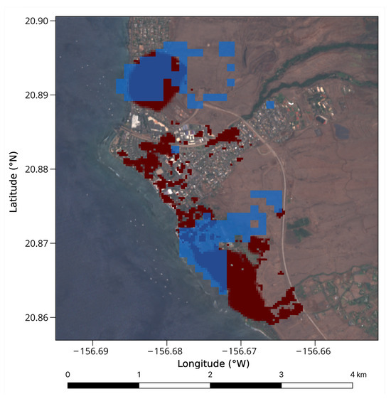 Landsat-8 SWIR band 6 (red) at 30 m resolution superimposed by GRNHFX (heat flux from ground fire; blue) from the simulation at 10:25 pm HST. To remove background values, radiance measurements are removed from the Landsat image when they are lower than 6000 Wm−2sr−1µ−1.