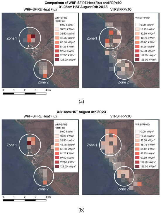Heat flux from WRF-SFIRE compared with two overpasses of VIIRS fire radiative power ×10, with zones used for summation outlined in white. Panels show different times: (a) 2023-08-09 01:25:00 HST, and (b) 2023-08-09 02:14:00 HST.