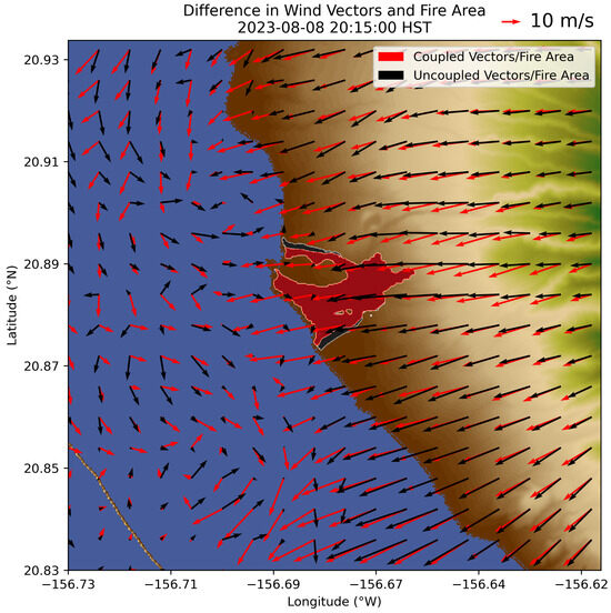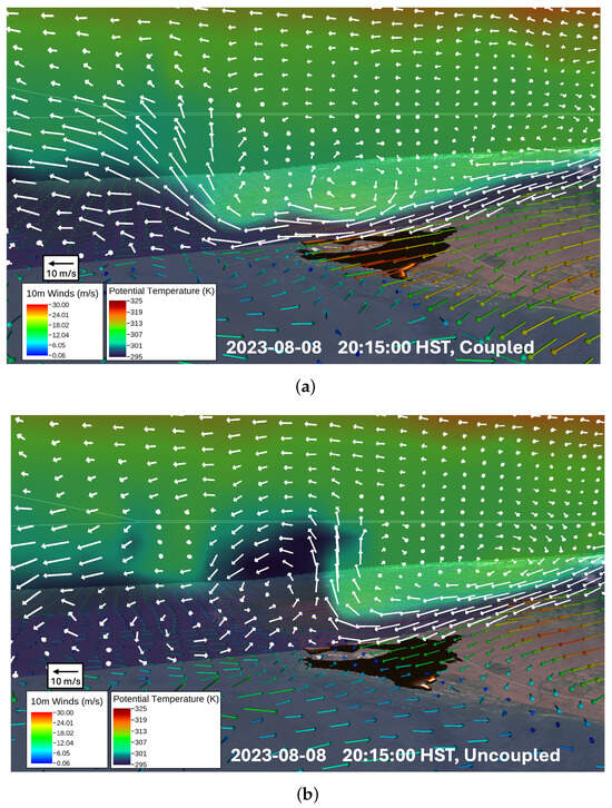 Later in the evening, around 18:00 HST, a significant divergence in the hydraulic jump location occurred between the coupled and uncoupled simulations. In the coupled scenario, the surface winds strengthened, positioning the hydraulic jump offshore. By contrast, in the uncoupled simulation, the weaker surface flows allowed the hydraulic jump to advance further inland, enabling earlier vortex formation near the fire front. This dynamic is visualized using the Vapor 3-D software version 3.8.1 from NCAR [49], as shown in Figure 11. The inland movement of the hydraulic jump in the uncoupled simulation facilitated earlier lateral growth along the northern and southern sectors of the fire, marking the beginning of the divergence in the burned area between the two simulations. This divergence is depicted as the onset of positive values in Figure 10, representing the delayed fire arrival in the coupled simulation.