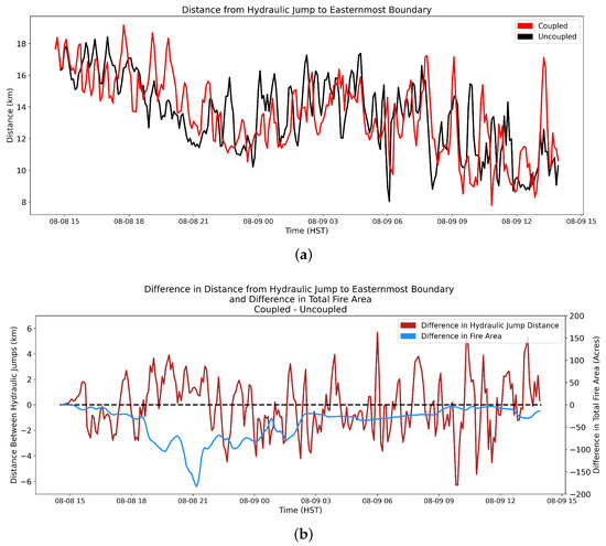 (a) Running 3-point average of the distance of the hydraulic jump from the easternmost boundary in both the coupled and uncoupled simulations. (b) Difference in distances of the hydraulic jump between coupled and uncoupled simulations, shown in panel (a). The difference in fire area between the two simulations is also shown.