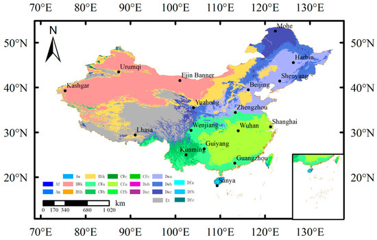 The following data were collected from 2015 to 2020 from 17 representative regions in China (Figure 1, Table 1): Rs, Rd, n, mean temperature (Tmean), maximum temperature (Tmax), minimum temperature (Tmin), air pressure (Pr), relative humidity (Rh), precipitation (Pt), wind speed (Ws), and major air pollutant mass concentrations (PM2.5, PM10, CO, SO2, NO2, and O3) as well as the calculated air quality index (AQI). Meteorological and radiation data were obtained from the China Meteorological Data Network accessed on 11 January 2023 (https://data.cma.cn/, accessed on 1 October 2024). Air pollutant data were derived from the China National Environmental Monitoring Center (http://www.cnemc.cn/, accessed on 1 October 2024). In addition, the values of extra-terrestrial solar radiation (Ra), maximum sunshine duration (N), and vapor pressure deficit (Vpd) were determined according to the methods described by Allen et al. [44]. Some incomplete abnormal data were removed from the data set. Notably, Rd/Rs, Rs/Ra, and n/N were greater than 1 [45].
