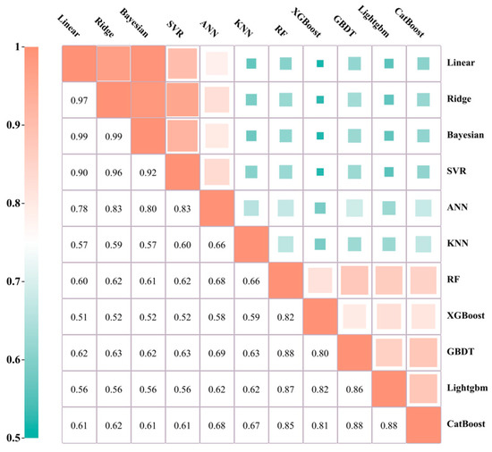 In stacking ensemble learning, the selection of learners is essential: the basic learners should choose models with stable performance to improve the overall performance of the model, and maximal differences among learners during learner selection should be ensured. This is necessary because different models essentially use different data spaces and data structures by observing data and building the corresponding models afterward. Additionally, this process is dependent on the principles underlying the algorithms themselves. Therefore, selecting learners that differ considerably can ensure that the advantages of different algorithms are leveraged and each differentiated model learns the benefits of other models. In this study, the Pearson correlation coefficient [48] is used to calculate the difference degree for each model to select the model with a large difference degree. Figure 2 shows that the correlations of the algorithms are generally high due to the high learning ability of the different algorithms. The linear model-based models (linear, ridge, and Bayesian) have the highest correlation, followed by the tree-based ensemble algorithms (RF, XGBoost, GBDT, LightGBM, and CatBoost), mainly because of the apparent similarity in the data observation methods for the same class of algorithms and the low correlation of the different principle models, which is attributable to the training mechanisms of the models with other principles also being very different. Considering the algorithm performance and relevance, we chose the Bayesian model in the linear approach, XGBoost in the ensemble approach, and three other approaches with different operational principles (SVR, ANN, and KNN) as the base learner. A meta-learner mainly considers the generalization ability of the model and robustness to overfitting and generally chooses a relatively simple linear model. In contrast, elastic network regression constrains the coefficients by introducing L1 and L2 regularizations, which can screen the base learner and assign the learner different weights according to the coefficient, which helps improve the generalization ability of the model and combine the advantages of multiple models. The learner principle for building the stacking model is presented in the following sections.
