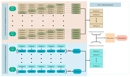 Stacking is a new ensemble approach for enhancing predictive potential and adjusting the bias-variance trade-off of base learners [57,58]. The first-layer model in stacking ensemble regression is the base model, which has different types of basic learners for training the original data set. K-fold cross-validation is performed for a single regression model to avoid overfitting. In the second-layer model, the k training predictions of the base model are included in the characteristics of the meta-learner training data, and the label of the new sample is still that of the original piece. Finally, the new model is used for training and prediction. The meta-learner can fully generalize and correct errors in the output of the first layer, thus improving the accuracy of the model [59]. Figure 3 shows the stacking model.
