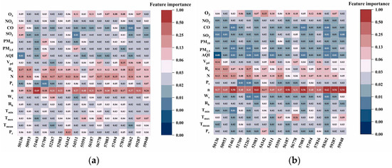 The results of feature selection using CatBoost to predict Rs and Rd are shown in Figure 4. The figure shows that n is the most critical factor affecting Rs, and the mean value and range of its importance are 0.47 (0.17–0.62). The results of the Rd feature selection show that n is the most important factor influencing Rd, and it is the first influencing factor in all regions except Mohe and Shenyang. The mean and range of its importance are 0.28 (0.08–0.69), and n is the second most important influencing factor in Mohe and Shenyang. N is the primary influencing factor of Rd in Mohe and Shenyang, and the feature importance values are 0.18 and 0.13, respectively. N and Ra performed better in calculating the characteristic importance of Rs and Rd than other factors except for n. The mean and range of the importance of Rs were 0.10 (0.04–0.21) and 0.08 (0.03–0.17), respectively, and the mean and range of the importance of Rd were 0.13 (0.03-–0.17) and 0.10 (0.03–0.15), respectively. This result is attributable to n being the most direct factor affecting radiation, whereas N and Ra are closely related to n. Although temperature-related characteristics can indirectly reflect cloud cover, the relationship between radiation and temperature is weaker than that between radiation and n [61,62]. Utilizing O3 data yields better performance than when other air pollution and meteorological data are utilized (except n, N, Ra), as revealed in the Rs and Rd of the characteristic importance calculation results. The mean value of its importance between 0.06 (0.01–0.15) and 0.05 (0.02–0.11) yields this result because Rd is the solar radiation passing through airborne substances, such as aerosols and molecules in the air scattered and formed by diffuse reflection from the surface, and O3 can scatter and absorb solar radiation, thus reducing the solar radiation reaching the Earth’s surface. Therefore, introducing air pollution is important for solar radiation prediction, which is consistent with the findings of previous studies, such as that by Mohammadi et al. [63], who evaluated the influence of nine characteristic factors on the prediction of daily radiation in Iran using the ANFIS model. They showed that n, N, and Ra are the most influential input parameters for predicting Rs and Rd. Furthermore, Fan et al. [64] confirmed that air pollution improves Rd prediction accuracy. The specifics of the feature ranking slightly differ among stations, presumably due to the geographical location and climatic differences among stations.
