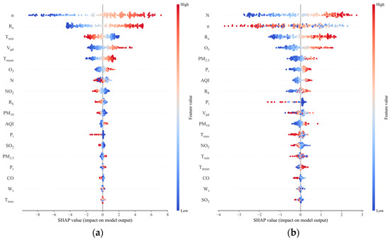 The SHAP value of input features in Beijing: (a) (Rs); (b) (Rd). Note: Red indicates high eigenvalues, and blue indicates low eigenvalues. A SHAP value greater than 0 indicates that the feature has a positive impact on radiation, and a SHAP value less than 0 indicates that the feature has a negative impact on radiation.