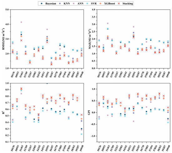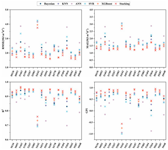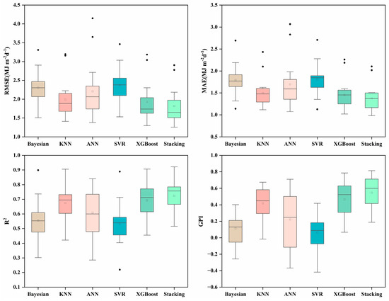 Seventeen radiation stations in different regions of China were considered. After applying the CatBoost feature selection algorithm, the selected features were further input into different models. The results of these models in the testing phase are shown in Table A2. Figure 7 and Figure 8, and Table A2 reveal that XGBoost and KNN performed better than the other base learners, and the range and mean values of the XGBoost model RMSE, MAE, R2, and GPI in predicting Rs were 1.6322–3.9516 (2.0580), 1.2141–2.8782 (1.5218), 0.7330–0.9564 (0.9124), and from −0.7450 to 0.9210 (0.6326), respectively. The ranges and means of the RMSE, MAE, R2, and GPI of the KNN models were 1.7749–4.1885 (2.2043), 1.3251–2.8946 (1.6244), 0.7000–0.9575 (0.8988), and from −0.9434 to 0.8271 (0.5165), respectively. The ranges and means of the RMSE, MAE, R2, and GPI of XGBoost models for predicting Rd were 1.2996–3.1848 (1.9300), 1.0189–2.2588 (1.4250), 0.4551–0.9058, (0.6932) and 0.0665–0.7855 (0.4659), respectively. The ranges and means of the RMSE, MAE, R2, and GPI of the KNN models were 1.4109–3.1970 (1.9891), 1.1182–2.4330 (1.4688), 0.4216–0.9051 (0.6753), and from −0.0161 to 0.6746 (0.4186), respectively. Because XGBoost is an ensemble learning method, it can accurately upgrade a weak learner to a stronger learner by integrating multiple base models to solve the problem. Its high training speed and strong generalization ability make it a popular choice [68]. XGBoost expands the loss function by Taylor’s second order and utilizes the first- and second-order derivatives for updating and iterating during optimization; the model makes full use of the data. Therefore, selecting a base learner with good performance improves the overall performance of the ensemble model [61,69]. The stacking model had the highest accuracy for predicting Rs. The range and mean values of RMSE, MAE, R2, and GPI were 1.5737–3.7482 (1.9318), 1.1773–2.6814 (1.4336), 0.7597–0.9655 (0.9226), and from −0.5614 to 0.9542 (0.7122), respectively. Stacking had an RMSE and MAE mean reduction range of 6.14%–25.25% and 5.79%–26.48%, respectively, and the R2 mean improvement range was 1.12%–7.09%. The range and mean values of RMSE, MAE, R2, and GPI for the highest accuracy in predicting Rd compared to the base learner were 1.2589–2.9038 (1.8201), 0.9811–2.1024 (1.3493), 0.5153–0.9217 (0.7248), and from 0.1877 to 0.8135 (0.5472), respectively. Stacking had an RMSE and MAE mean reduction range of 5.70%–23.27% and 5.31%–24.30%, respectively, and the R2 mean improvement range was 4.56%–36.24%, demonstrating that the accuracy improvement in stacking is great, and the ensemble learning model construction is effective.