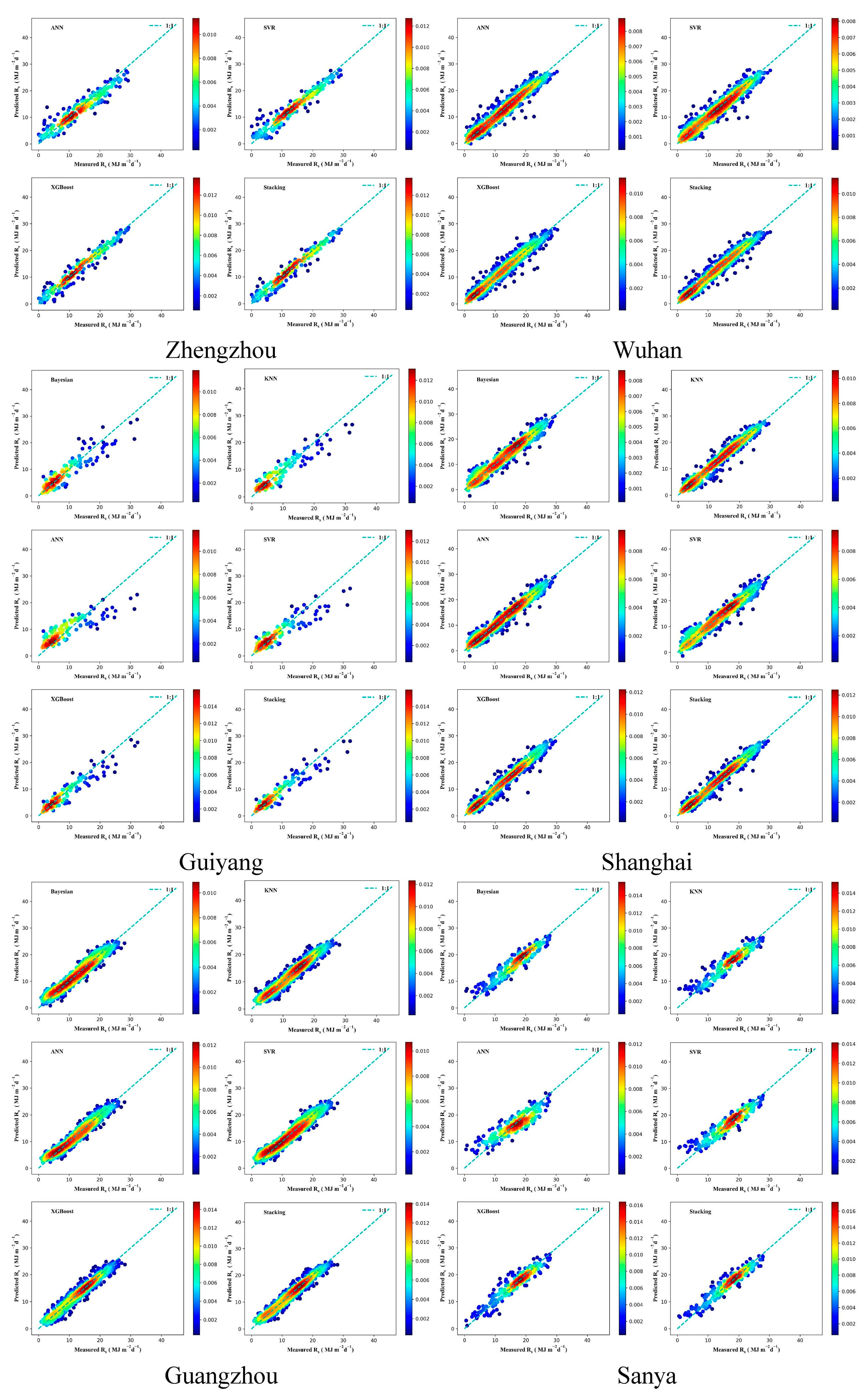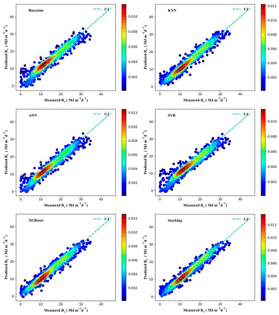 Scatter density plot of different models in estimating Rs.