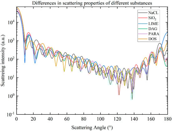 In the simulation experiment, six kinds of particles with different refractive indexes were used, and the diameter of the fine particles was 2 μm. It was assumed that the particle size did not affect the performance. The selected particles were sodium chloride (1.54-0i), silica (1.53-0.008i), limestone (1.65-0i), diacylglycerol (1.47-0i), paraffin oil (1.48-0i), and dioctyl sebacate (1.45-0i). The refractive indices of sodium chloride, limestone, diacylglycerol, paraffin oil, and dioctyl sebacate have a virtual part of zero, indicating that these are non-absorbing particles. The light-scattering intensity was calculated using Mie scattering theory over a scattering angle range of 0° to 180°.