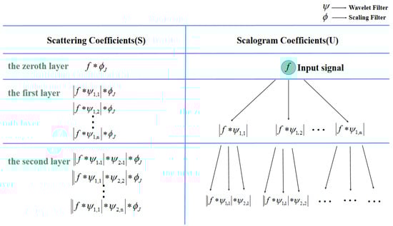 The feature vector, composed of all scattering coefficients from the zeroth order to the m-order of scattering transform, is obtained in Equation (8):