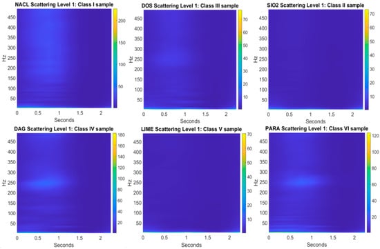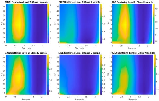 Figure 8, there were significant differences in the scatter plot distribution of the higher-order scattering coefficients of the signals corresponding to these six different types of particles. Among them, NaCl is an inorganic salt with good solubility, DOS is a common plasticizer, and DAG is a hydrophilic triol. The scatter plots of these three substances are darker but not identical. SiO