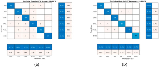 Table 2, the classification model of the BO-WST-LSTM network outperformed other methods in terms of accuracy, macro precision, macro recall, and macro F1 score, with values of 98.83%, 98.82%, 98.89%, and 98.85%, respectively. The results indicated that the BO-WST-LSTM model could effectively and accurately classify and identify six different types of particles: sodium chloride, silica, lime, glycerol, paraffin oil, and dioctyl sebacate. This also provided a feasible basis for preventing air pollution and rapidly identifying particle sources.