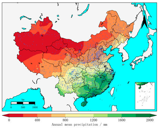 The filled colors in Figure 1 indicate the annual mean precipitation. Figure 1 shows that precipitation in Southeastern China can reach up to 1600 mm, while in parts of Northwestern China it is only 200 mm. The number of sites in the eastern region is much greater than the number of sites in the western region.
