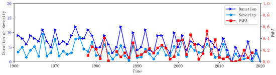 The time series of drought duration, drought severity and PAFA in Heilongjiang Province.