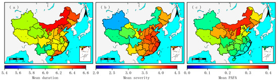 The annual average of the variables of each province: (a) drought duration; (b) drought severity; (c) PAFA.