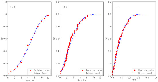 From Figure 3a, it can be seen that the average drought lasts about 6 months per year in most parts of the country, which is consistent with the definition of the SPI, i.e., droughts and floods are 50/50. In addition, it can be seen from the figure that the average duration of drought in the northern regions of China, such as Inner Mongolia, Heilongjiang, Liaoning, and Hebei, is relatively slightly larger than 6.4 months, but the difference with 6 months is not significant. As can be seen from Figure 3b, the drought severity in the eastern and southern regions of China is significantly larger relative to the northwestern region, with a difference of up to two times in some areas. Figure 3c shows that the PAFA is significantly higher in the north than in the south, suggesting that the north is more prone to large-scale agricultural droughts, which may be related to the abundance of rainfall in the south and the development of irrigation technology. From the comparative analysis of the subplots in Figure 3, it can be seen that the long drought duration may be the main reason for the high PAFA in the northern region. Solving the distribution function of each variable is an important step in building a copula analytical model. Zuo et al. [13,30] showed that the distribution functions of drought duration and drought severity can be well derived based on the maximum entropy method, so the distribution functions of each variable in this paper will also be derived based on the maximum entropy method. The provincial PAFA data are all missing from 1961 to 1977, but this does not affect the calculation of the distribution function for this variable, which was calculated based on the 1978–2021 data. And the distribution function of drought duration and drought severity is calculated based on 1961–2021. According to the previous sensitivity analyses [38,39], when the sample size is greater than 30, the distribution functions obtained are almost identical. Still taking Heilongjiang Province as an example, Figure 4 gives a comparison between the empirical distribution and the distribution function derived from the maximum entropy principle.