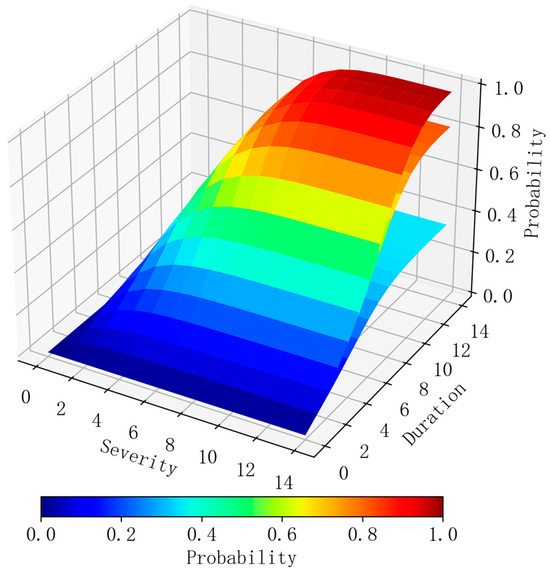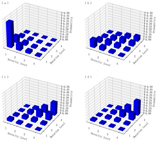 In Table 3, the proportion of drought events corresponding to level 1 for drought duration and severity is 0.41, level 2 is about 0.24, level 3 is about 0.2 and level 4 is about 0.15. When the PAFA is known, the size of the probability under different drought duration and drought severity levels can be calculated. The result of probability is shown in Figure 7.