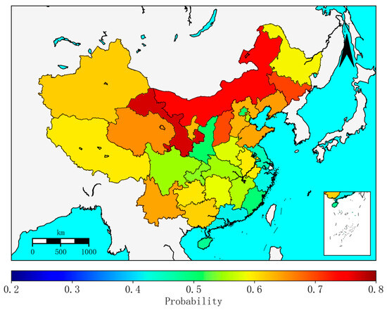 As can be seen from Figure 8, although it is the same type of drought event, the north and south of China show a large difference. The probability of the occurrence of a drought event in the northern region is about 0.7, while the probability of the occurrence of a drought event in the southern region is about 0.4 to 0.6. Probabilistic analyses of other types of drought events show that, for the same PAFA, it can occur in the northern region with a smaller drought duration and drought severity, while the southern region requires a larger drought duration and drought severity. For example, at a PAFA of 10% to 30%, Jiangsu, Anhui, Zhejiang, Jiangxi, Fujian and Guangdong need a drought duration greater than 9 months and a drought severity greater than 6, whereas most of the northern regions can experience this damage rate when the drought duration is less than 5 months and the drought severity is less than 2.4. This indicates that longer drought durations and greater drought severity are needed in the south to achieve the same rate of damage as in the north, which may be related to the relative development of water facilities and irrigation technology in the south.