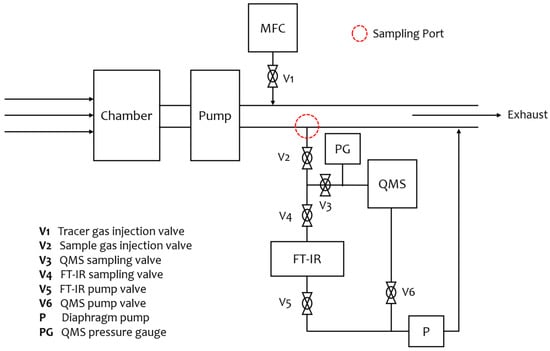 The volumetric flow rate of F-gases is determined by injecting an inert gas (such as helium or krypton) as a tracer gas into the pipeline through which the process exhaust gas flows using an MFC. The concentration of the tracer gas is then measured using a QMS. The volumetric flow rate of the process exhaust gas is calculated using Equation (1) as follows: