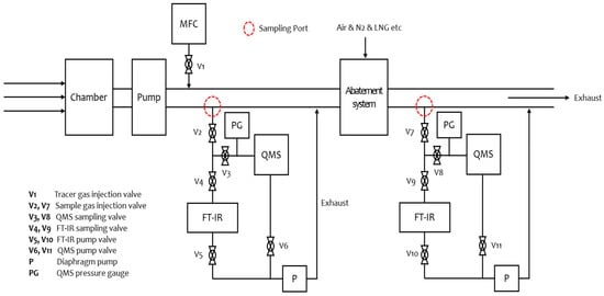 The configuration for measuring the destruction efficiency of abatement equipment is shown in Figure 2. Sampling ports are installed in the pipelines connected before and after the abatement equipment to create tracer gas injection lines and sample gas inlet lines, with valves installed at the upstream ends. Similar to the flow rate measurement setup, the distance between the tracer gas injection line and the sample gas inlet line should be as far apart as possible to allow sufficient mixing of the tracer gas before it is measured at the sample gas inlet. The results from the QMS and FT-IR were monitored in real time, and the volumetric flow rate and concentration of F-gases were continuously measured over a one-hour period.