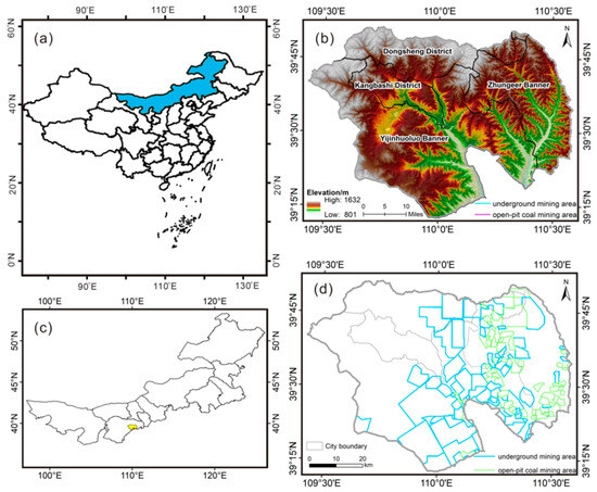 Research map includes (a) location of UMRB within China, (b) elevations and administrative divisions, (c) location within Inner Mongolia, (d) and distribution of coal mines.