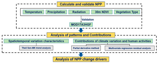 The NPP estimation models primarily include three types: ecological process models, statistical models, and parameter models [10,11,12]. The CASA model, which was founded on the principle of maximizing light energy utilization efficiency, has found broad application in NPP studies because it thoroughly accounts for environmental factors [13,14,15]. However, the traditional CASA model tends to ignore regional differences when applied at global or large, regional scales. To address this limitation, some scholars have optimized the CASA model by building upon the classical version [16,17], adapting it to China’s specific ecological environment and data characteristics, resulting in strong regional adaptability [18] and high resolution [19]. This optimized model has been applied in several regions in China, including the Yangtze River Basin [20], Northeast China [21], and the arid regions in Northwest China [22]. The spatiotemporal variability in NPP is influenced not only by model accuracy, but also by a range of other driving factors. The driving forces of NPP changes are complex and impacted by a combination of climatic, geographic, and anthropogenic factors [23]. Most existing studies have used methods such as residual analysis and geoprobes to attribute the influence of vegetation to the climate and humans [24,25], whereas only a few scholars have quantified the contributions of individual drivers [26,27,28]. Current research generally lacks the support of long-term series and high-resolution data, and the exploration of the driving forces of different regional types is not deep enough, making it difficult to accurately grasp the long-term trends and refined characteristics of NPP.