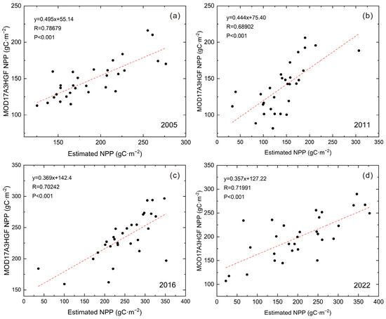 Comparison of estimated NPP to MOD17A3HGF NPP: (a) comparison in 2005, (b) comparison in 2011, (c) comparison in 2016, (d) and comparison in 2022.
