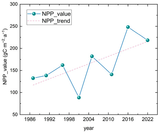 The average annual NPP of the UMRB exhibited a fluctuating upward trend between 1987 and 2022 (Figure 4). The long-term mean NPP in the UMRB reached 168.43 gC/m2/a, with annual NPP values fluctuating around this multiyear average. In 1987, the average NPP was 132.49 gC/m2/a, increasing to 218.39 gC/m2/a by 2022, representing a 64.84% increase. The lowest average NPP value was recorded in 2001 at only 88.62 gC/m2/a, whereas the highest was recorded in 2016 at 248.27 gC/m2/a. The fluctuating increase in NPP is mainly influenced by the year-to-year changes in climatic conditions and HAs. Of these, the year-to-year changes in precipitation and temperature play a crucial role in NPP, with the years with more precipitation leading to an increase in NPP and the dry years leading to a decrease in NPP. HAs, such as mining and land reclamation, also contribute to these fluctuations, with mining activities leading to a temporary decline in NPP due to vegetation destruction, while reclamation efforts promote vegetation growth in the subsequent years. In addition, the dynamic recovery of vegetation and ecosystem adaptation processes also contribute to fluctuations in the annual values of NPP.