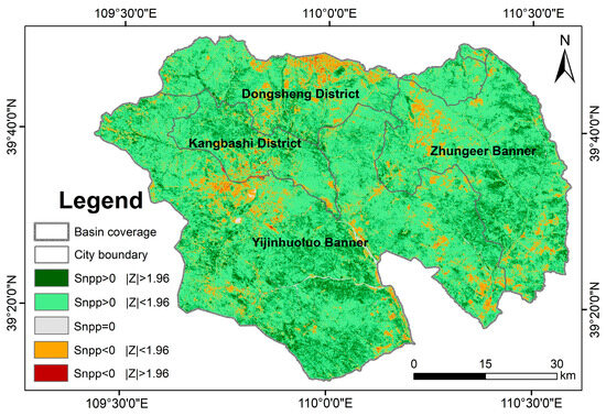 The spatial distribution of NPP trends in the UMRB, 1987–2022. Snpp stands for the Sen slope of NPP, and |Z| is an indicator of the statistical test.