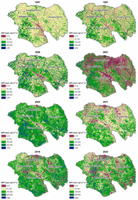 The spatial pattern of NPP between 1987 and 2022, as estimated by the CASA model (Figure 6), closely matches the expected trends in terms of temporal variations, regional distributions, and absolute NPP values. The flat terrain in the southwestern UMRB represents a high NPP zone, indicating stable ecological conditions and healthy vegetation growth. In contrast, low NPP values were found in the densely populated areas and the OPM areas, including Dongsheng District, Ordos city, Ejin Horo Banner, Zhungeer Banner, and the sandy areas along the Ulan Mulun River in Ejin Horo Banner. Over time, the change in NPP over time has become particularly pronounced. The UMRB shows clear interannual NPP changes, with the lowest value recorded in 2001 at only 88.62 gC/m2/a. This was closely related to the peak of coal mining activities and the combined effects of climatic factors. Mining activities not only caused extensive damage to surface vegetation, but also altered land-use patterns, negatively impacting NPP. However, despite significant NPP declines in localized areas due to urbanization and resource extraction, the overall NPP of the UMRB has been recovering since 2005, especially in the regions distant from major development areas.