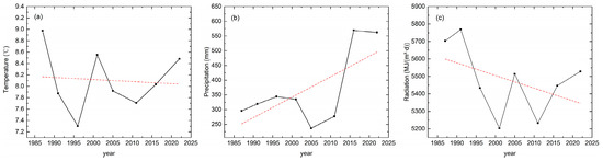 Interannual variations in mean temperature (a), cumulative precipitation (b), and radiation (c) in UMRB from 1987 to 2022.
