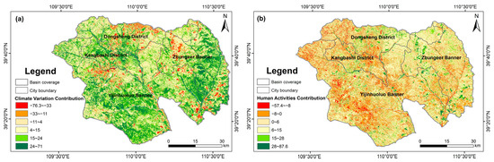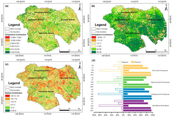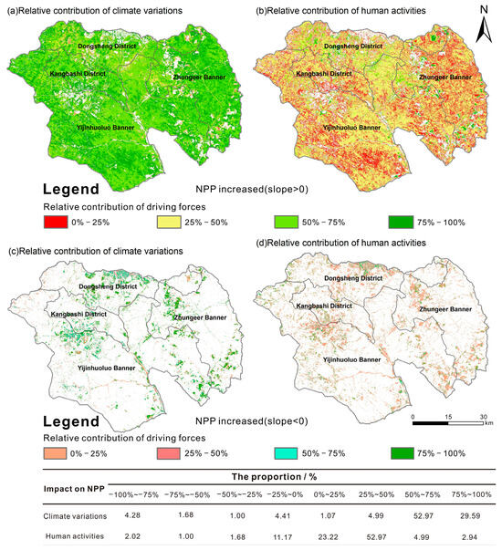 The impact of air temperature on NPP changes in the UMRB was mainly positive, with an area share of 95.55%, and this positive influence was widely distributed in Dongsheng District, Kangbashi District, Yijinholo Banner, and Jungar Banner. The negative effects accounted for 4.45% of the area and were concentrated mainly in the populated areas of Dongsheng District, Kangbash District, Yijinholo Banner, and the river valleys of Jungar Banner (Figure 10a,d). The trend of temperature change in the UMRB was not significant, and the vegetation was subjected to a range of temperatures suitable for growth; thus, the NPP changes were predominantly positive, and temperatures that were either too high or too low reduced the efficiency of photosynthesis. Higher temperatures may negatively affect NPP by decreasing the soil water content and increasing evapotranspiration, making water resources more scarce, an effect that is particularly pronounced in Inner Mongolia [46].