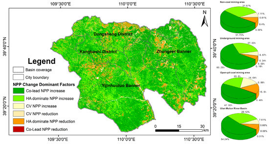 On the basis of the results of trend and contribution analyses, the NPP changes in the UMRB from 1987 to 2022 were partitioned into dominant factors (Table 3). The NPP in the UMRB was mainly elevated mainly by the combined dominance of CV and HAs, which covered 54.24% of the UMRB (Figure 12), and was mainly distributed mainly in the grassland cover-type areas. This indicates that the positive effects of CV and HAs (e.g., afforestation and grassland management) on vegetation growth were fully realized in these regions. The areas with climate-led NPP increases were distributed mainly in Dongsheng District and Jungar Banner, accounting for 7.61% of the total area, while the areas with HA-led NPP increases were widely distributed in the UMRB, with cropland being the dominant soil type, covering 29.12% of the basin. The areas with decreases in both CV- and HA-driven NPP in the UMRB made up 0.31% of the basin and were mainly concentrated around the periphery of the central urban zone. The climate-driven NPP reduction covered 0.66% of the area and was scattered across the populated regions, while the HA-led NPP decline was primarily located near the edges of towns and cities, as well as in the OPM areas, comprising 8.06% of the UMRB (Figure 12). This reflects, to some extent, the negative impacts on vegetation ecosystems caused by population density, urbanization development, and OPM. The strong intervention of HAs led to a significant reduction in NPP, especially at the periphery of towns and the OPM areas. Overall, the NPP changes in the UMRB were driven primarily by the interaction of CV and HAs, with the impacts of HAs and CV on NPP reduction being almost negligible.