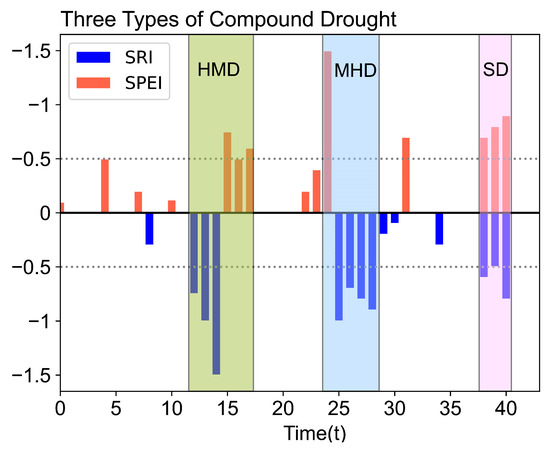 Three definitions of compound drought. The red columns represent SPEI, and the blue columns represent SRI. Only values less than 0 are displayed here. The three colored rectangles from left to right represent HMD, MHD, and SD, respectively. Only values that reach the drought threshold are counted in the compound drought events. In this diagram, the threshold used is −0.5, represented by the gray dotted line.