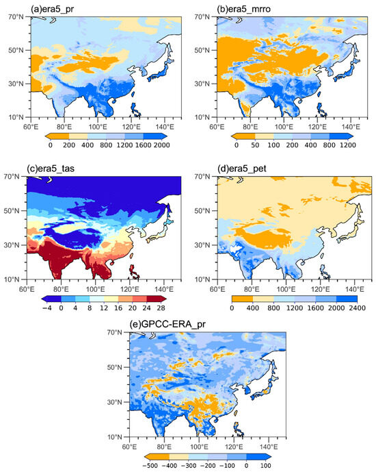 Spatial distribution of ERA5 for the period 1972–2022: (a) annual precipitation (unit: mm); (b) annual runoff (unit: mm); (c) monthly temperature (unit: °C); (d) annual potential evapotranspiration (unit: mm) calculated by the Thornthwaite method; (e) anomalies of annual average GPCC precipitation (unit: mm) minus ERA5 precipitation from 1981 to 2010.