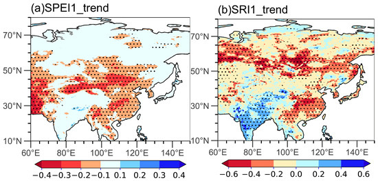 Spatial distribution of trend values of (a) SPEI1 and (b) SRI1 on the monthly scale from 1979 to 2022. Dotted areas pass the 95% confidence test according to the ERA5 dataset.
