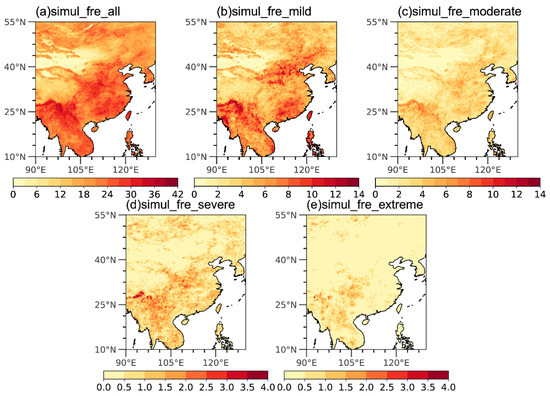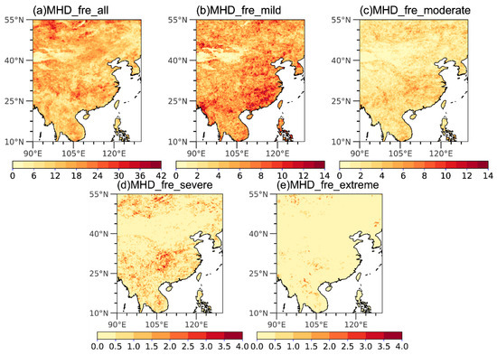 The (a) total, (b) mild, (c) moderate, (d) severe and (e) extreme drought relative frequency (unit: %) of MHD during 1979–2022 in East Asia. The drought thresholds are shown in Table 2. Results are calculated by ERA5 dataset. Note that the total drought here refers to the sum of all kinds of drought.