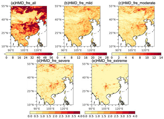 The (a) total, (b) mild, (c) moderate, (d) severe and (e) extreme drought relative frequency (unit: %) of HMD during 1979–2022 in East Asia. The drought thresholds are shown in Table 2. Results are calculated by ERA5 dataset. Note that the total drought here refers to the sum of all kinds of drought.