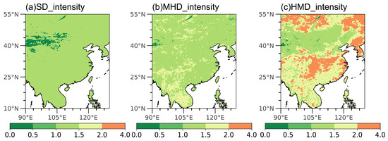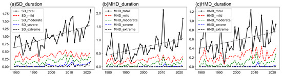 Regional average intensity of (a) SD, (b) MHD and (c) HMD in China during 1979–2022.