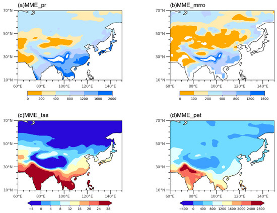 Multi-model ensemble distributions of annual means based on CMIP6 historical simulations from 1979 to 2014: (a) annual precipitation (mm); (b) annual runoff (mm); (c) monthly temperature (°C); (d) annual evapotranspiration (mm).