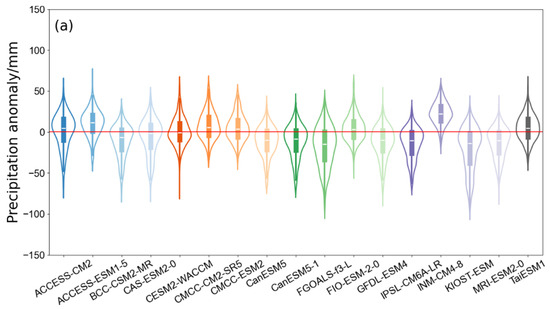 Figure 10 reveals the spatial distribution of precipitation as simulated by multiple models. Overall, the average simulated data align well with the ERA5 records. The absence of comprehensive historical data results in the depiction of the Tibetan Plateau’s CMIP6 simulation values as excessively high [44]. Figure 11 evaluates the variance between the different model data and the ERA5 data across China. It displays the 25% to 75% quantile range for the differences in historical mean values. The runoff is mostly contained within a −25 to 25 mm range, indicating a tendency for some models to overestimate runoff. Precipitation differences are centered near 0 mm, with most falling within −25 to 25 mm, suggesting an accurate simulation of the historical period. The median temperature differences cluster between 0 and 5 °C, while different distribution is more balanced, spanning from −5 to 5 °C. The latitudinal patterns of temperature, runoff, and potential evapotranspiration, extending from northwest to southeast, are in agreement with the ERA5 data, showcasing consistent climatic trends across the region.