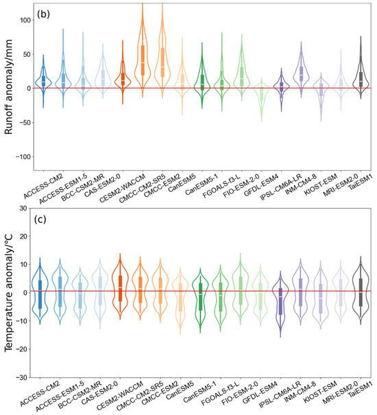 Violin plot distribution of climatic differences in China: (a) precipitation (unit: mm), (b) runoff (unit: mm) and (c) temperature (unit: °C). These differences are historical datasets assessed in comparison to the ERA5 reanalysis data spanning from 1979 to 2014. The red line indicates that the differences are 0. Box lines delineate the quartile range, marking the spread of the middle 25% of the data. The white points within the graph signify the mean values of each model. For more details of the models, refer to Table 1.