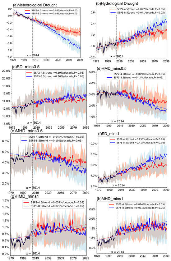 Estimated value change trends from 1979 to 2100 of (a) MD and (b) HD are expressed by SPEI1 and SRI1. Estimated change trends from 1979 to 2100 in the frequency of (c) SD, (d) HMD and (e) MHD when the drought threshold is −0.5 and (f) SD, (g) HMD and (h) MHD when the drought threshold is −1 under SSP2-4.5 and SSP5-8.5. The shaded areas represent 25% to 75% standard deviations of the 17 models. The red dashed and blue dashed lines are linear variations. The historical data of the period 1979–2014 are simulated using CMIP6 models.
