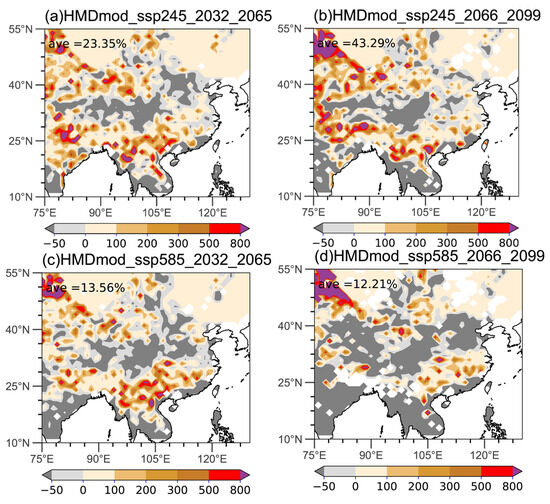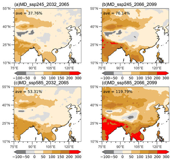 Projected frequency changes (unit: %) in the HMD below −1 (moderate) under SSP2-4.5 in (a) 2032–2065 and (b) 2066–2099 and the SSP5-8.5 in (c) 2032–2065 and (d) 2066–2099 (reference period 1981–2014 according to ERA5 dataset [27]).